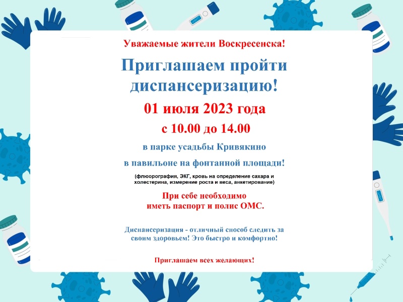 1 июля с 10.00 до 14.00 можно пройти диспансеризацию в парке усадьбы Кривякино: в павильоне на фонтанной площади.