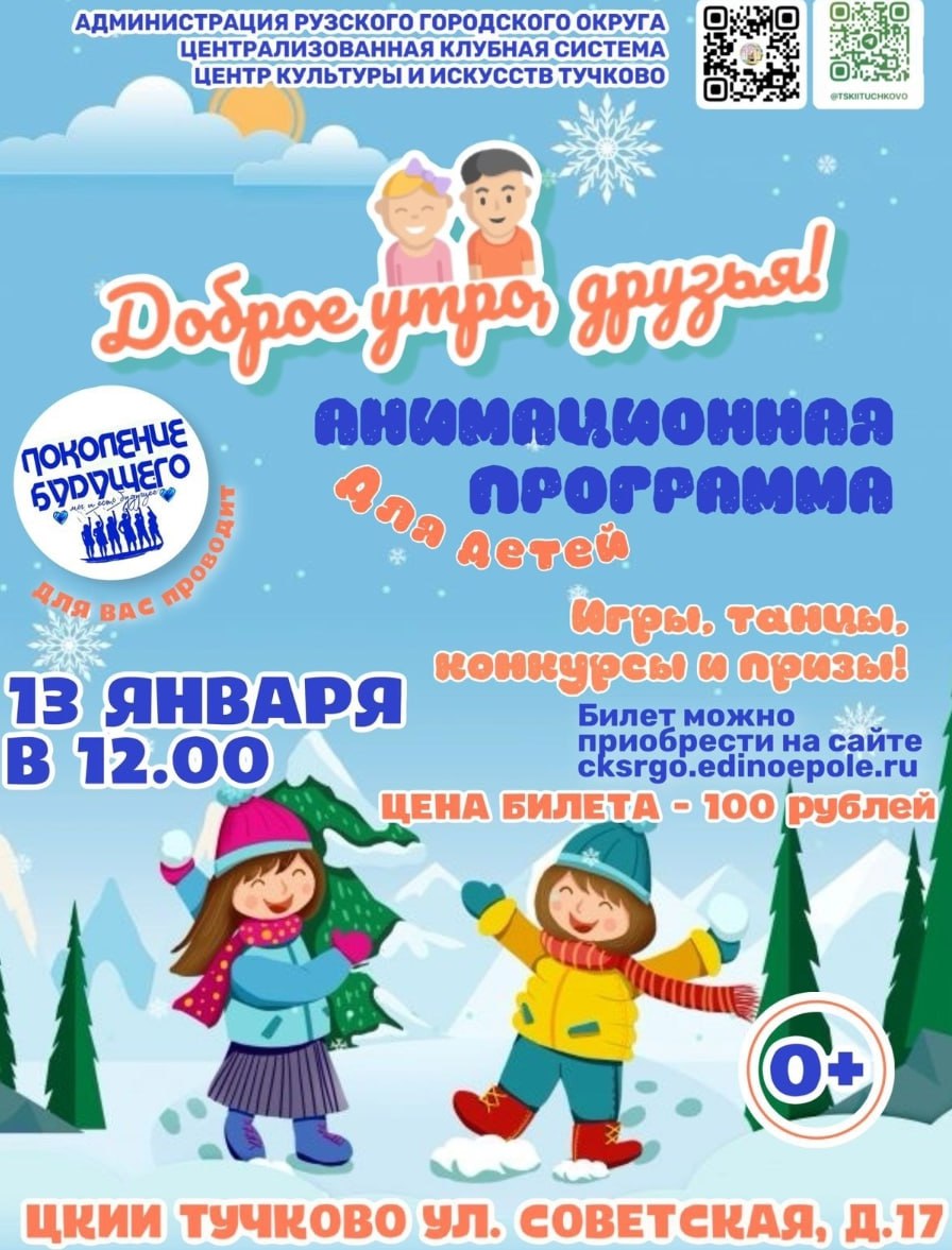 13 января в Тучковском центре культуры и искусств Рузского городского округа состоится анимационная программа для детей «Доброе утро, друзья!»
