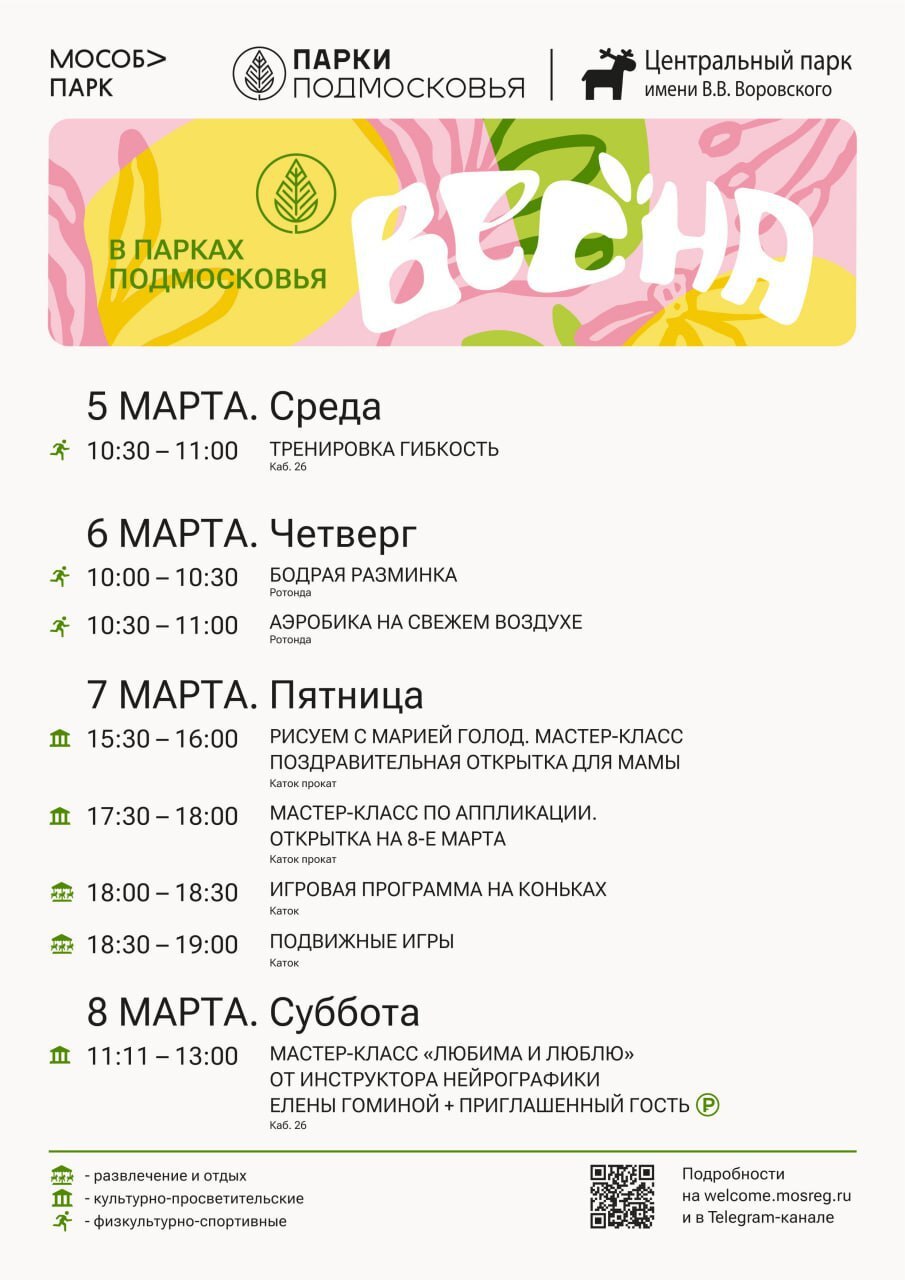 Жители смогут поучаствовать в интересных образовательных лекциях, поучаствовать в развлекательной программе парков округа. Для наших самых маленьких граждан в парках всегда есть программа занятий на выходных. Дети могут поучаствовать в творческих мастер-классах, побывать на уроках рисования и многое другое,а также посмотреть кино в закрытом тёплом павильоне.