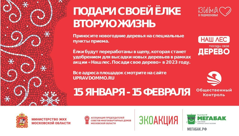 В рамках губернаторского проекта «Зима в Подмосковье» с 15 января по 15 февраля в Подмосковье пройдёт масштабная акция «Подари своей ёлке вторую жизнь»