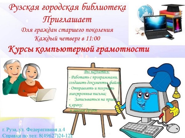 В Рузской городской библиотеке 2 ноября пройдут курсы компьютерной грамотности «WEB-Эрудит» для жителей старшего поколения. Начало в 11 часов.