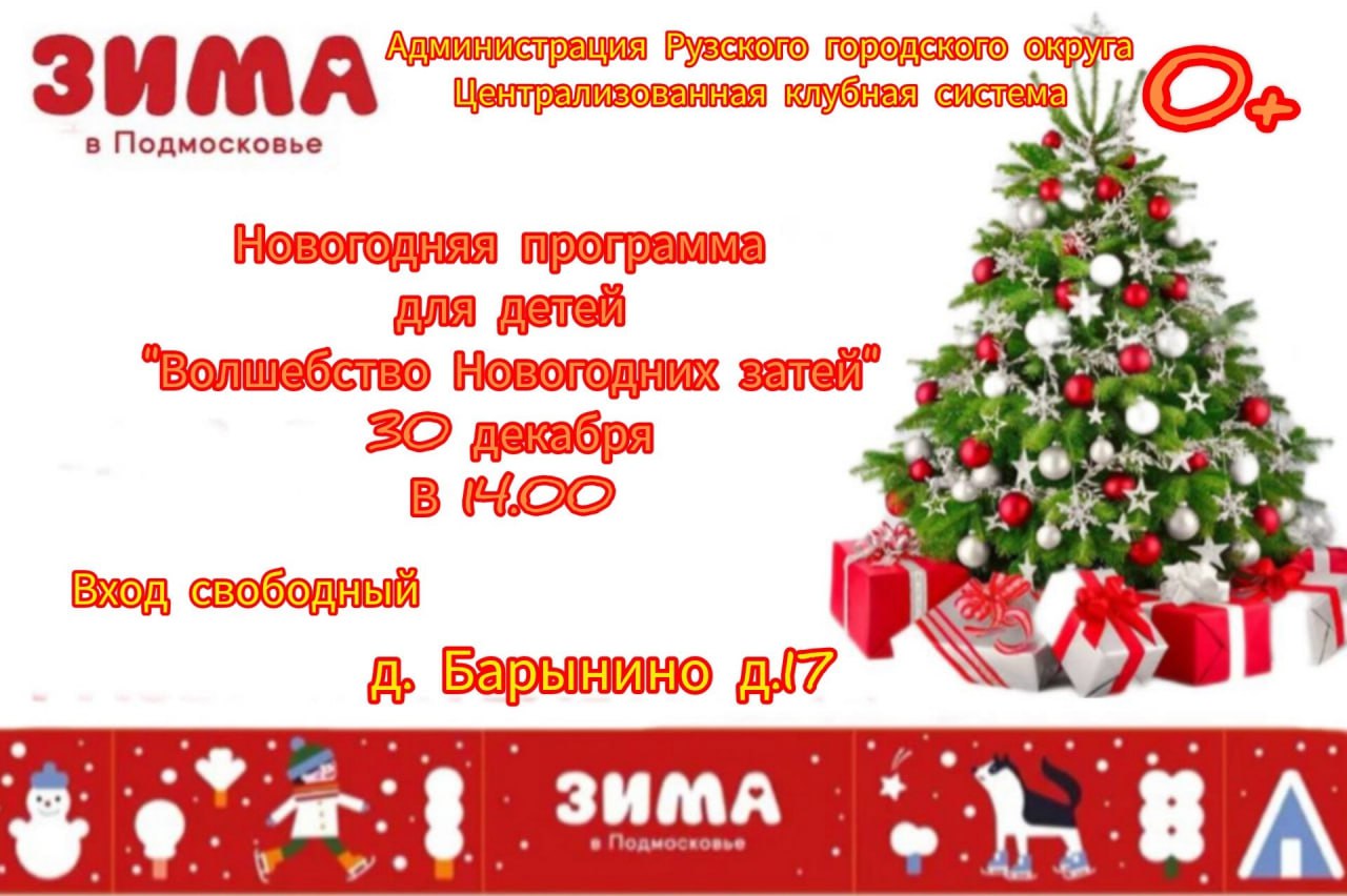 30 декабря в Барынинском сельском клубе Рузского городского округа состоится новогодняя программа для детей "Волшебство новогодних затей".