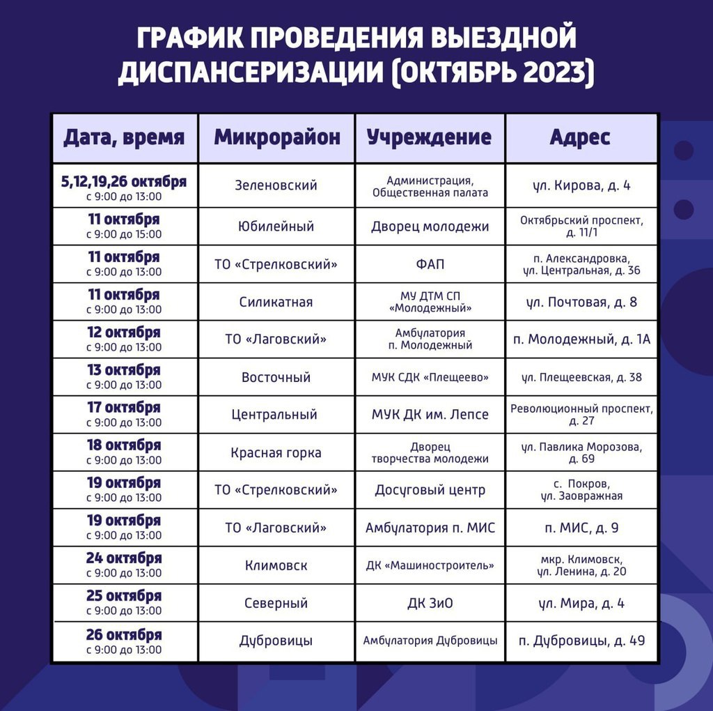 График работы выездных пунктов диспансеризации в Подольске в октябре 2023 года