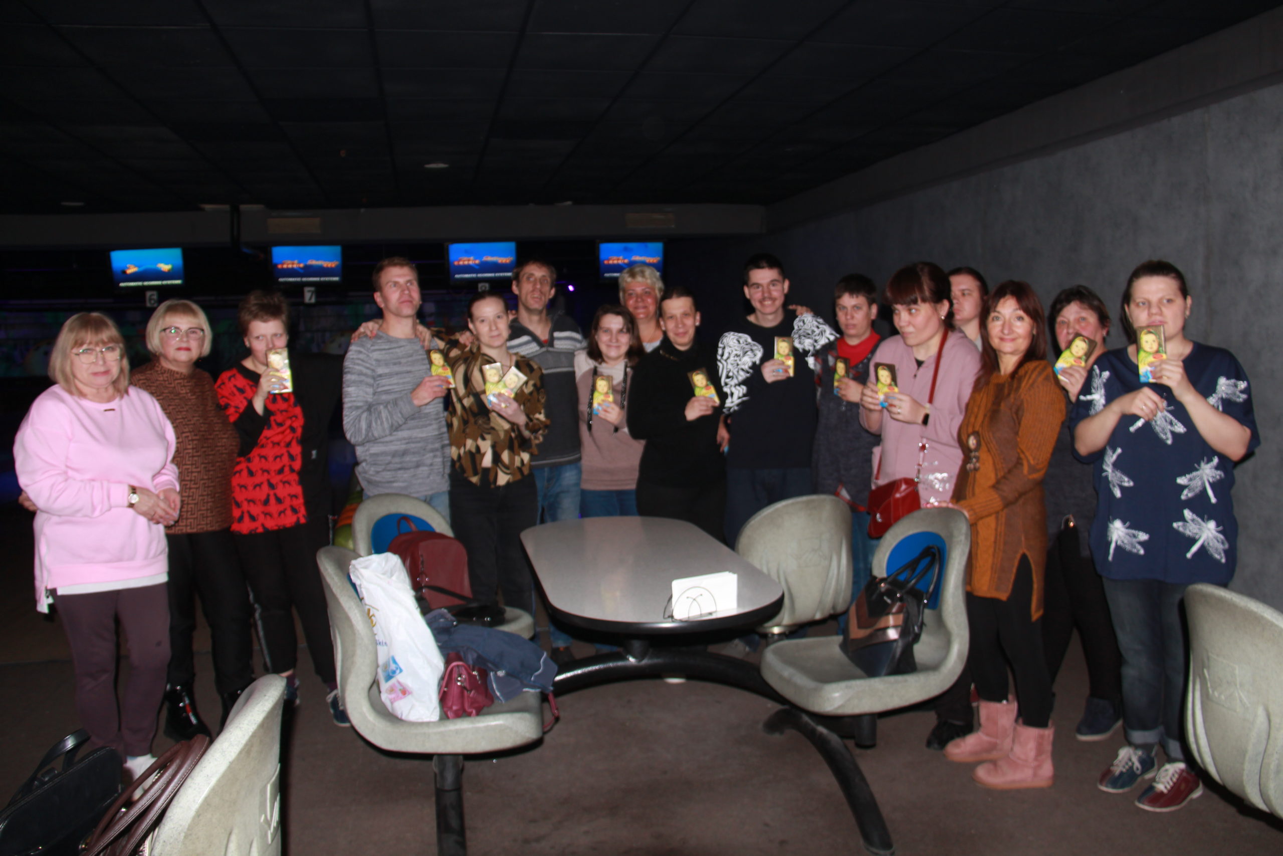 Развлекательное мероприятие для актеров инклюзивного театра «Мим» прошло в боулинг-центре «Олимп» при участии Юлии Гладышевой, Зинаиды Сидоровой, а также добровольцев Раисы Агаджаньян и Людмилы Костиной.