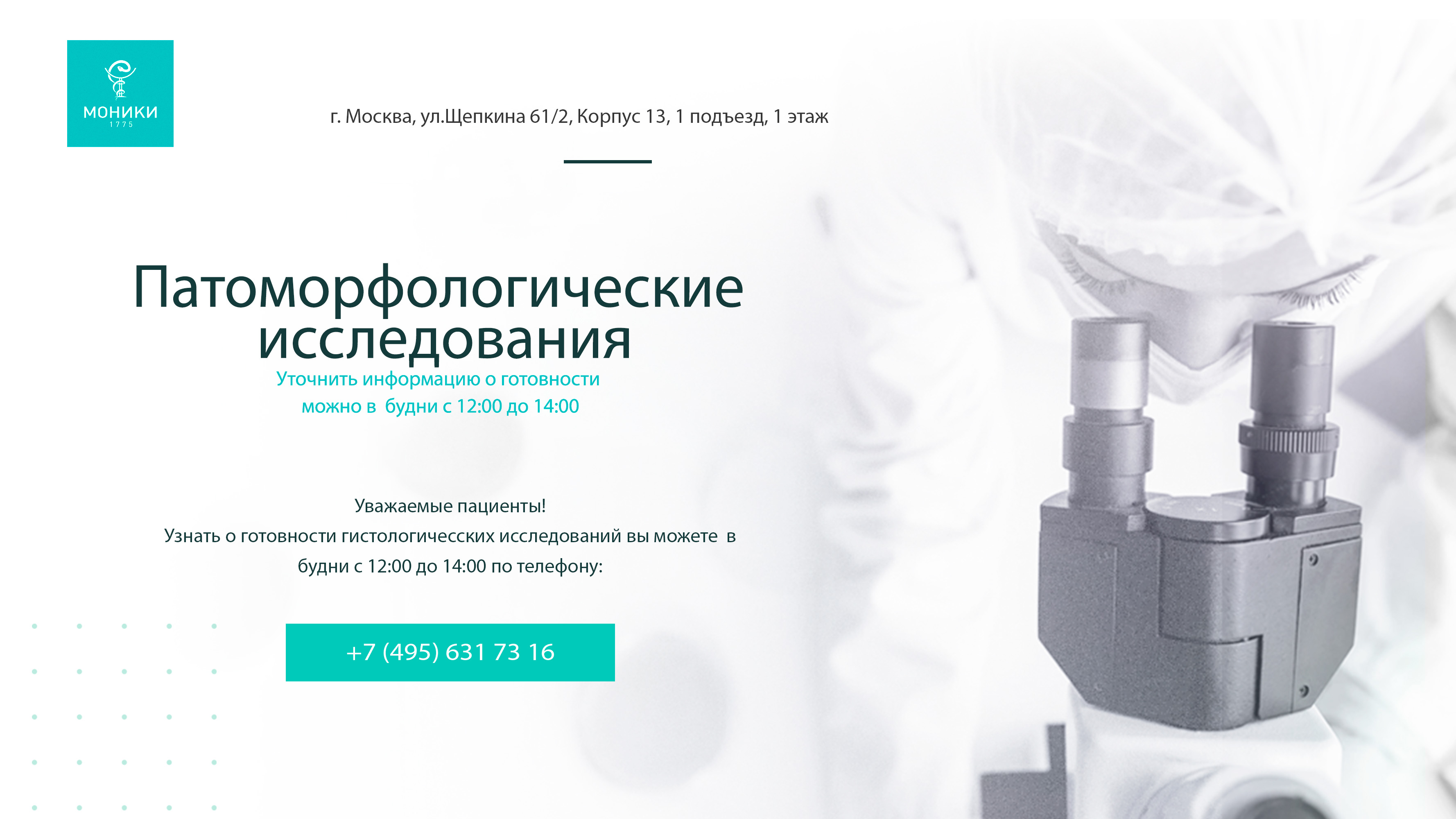 Узнать о готовности гистологического исследования можно в будни с 12 до 14 часов, по телефону 8-495-631-73-16
