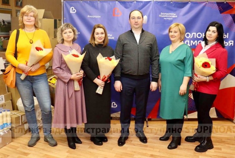 Руководитель муниципалитета, секретарь местного отделения партии «Единая Россия» Сергей Мужальских поздравил с  Международным женским днём волонтёров ступинского штаба помощи мобилизованным и их семьям.