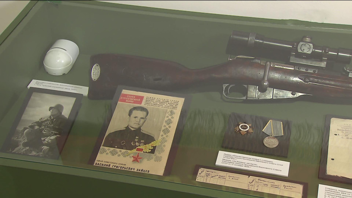 Среди экспонатов – лицевой счет легендарного снайпера Василия Зайцева, на счету которого более 225 немецких солдат и офицеров, в том числе 11 снайперов. "Считается, что наиболее опасная, наиболее сложная часть работы снайпера – это именно дуэль с таким же мастером. Зайцев, надо сказать, был на выдумки хитер. Например, были зафиксированы случаи, когда он делал куклу снайпера в человеческий рост и таким образом выманивал противника из укрытия, вынуждал выдать себя, то есть такой Шерлок Холмс, только в советской гимнастерке", – пояснил старший научный сотрудник Музея современной истории России Федор Кукин.